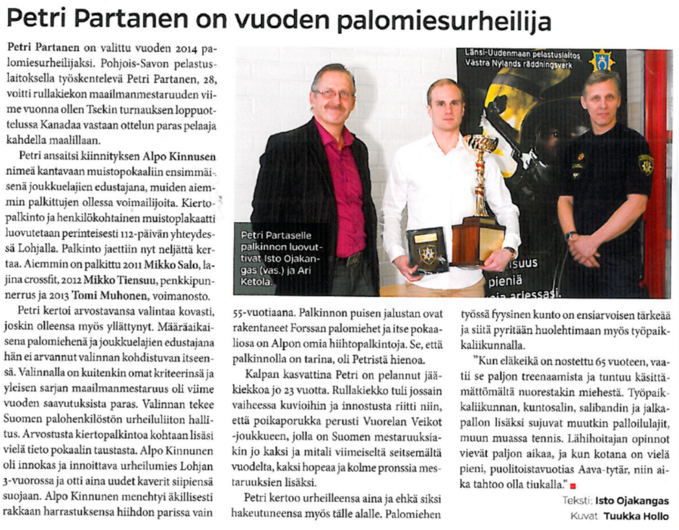 --- Pian sen jälkeen ryhdyimme Matin kanssa pohtimaan, miten voisimme parhaiten kunnioittaa Alpon muistoa. Itse ehdotin, että perustettaisiin muistopalkinto. Isommalla porukalla myös pohdittiin, että poliisit valitsevat Vuoden poliisiurheilijan, niin miksi ei valita Vuoden palomiesurheilijaa? Meillä on kuitenkin tosi paljon kovan tason urheilijoita.