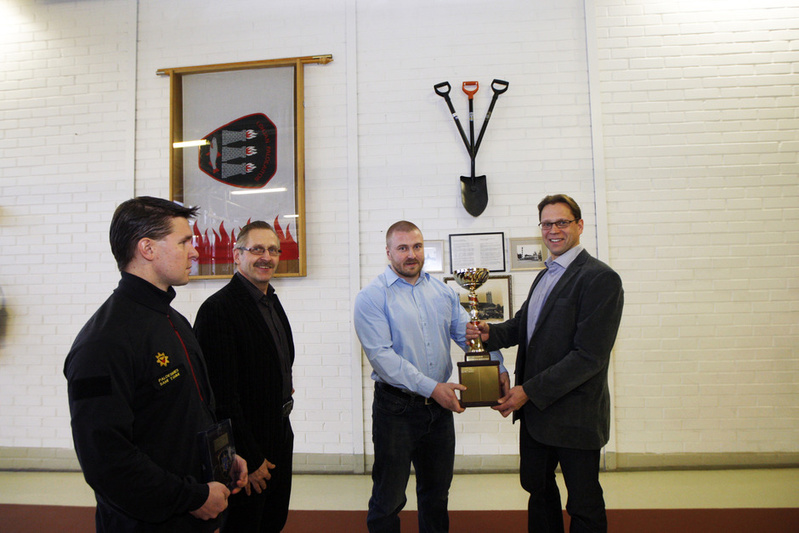 ![]() Vuoden palomiesurheilija palkiittin 112-päivänä Espoossa. Palkinnon luovutti paloesimies Petri Torkkel. Kuva: Susanne Vuorinen. |